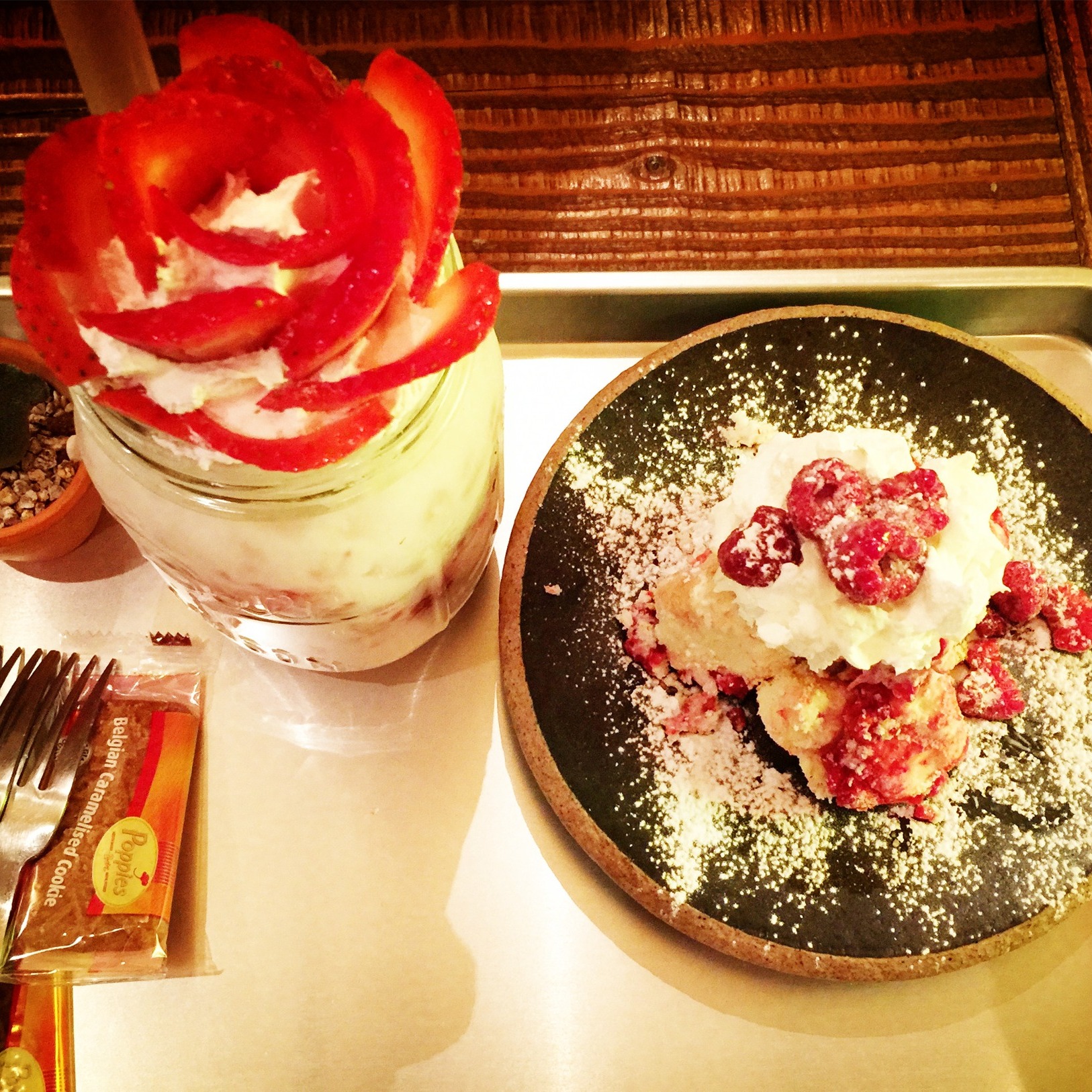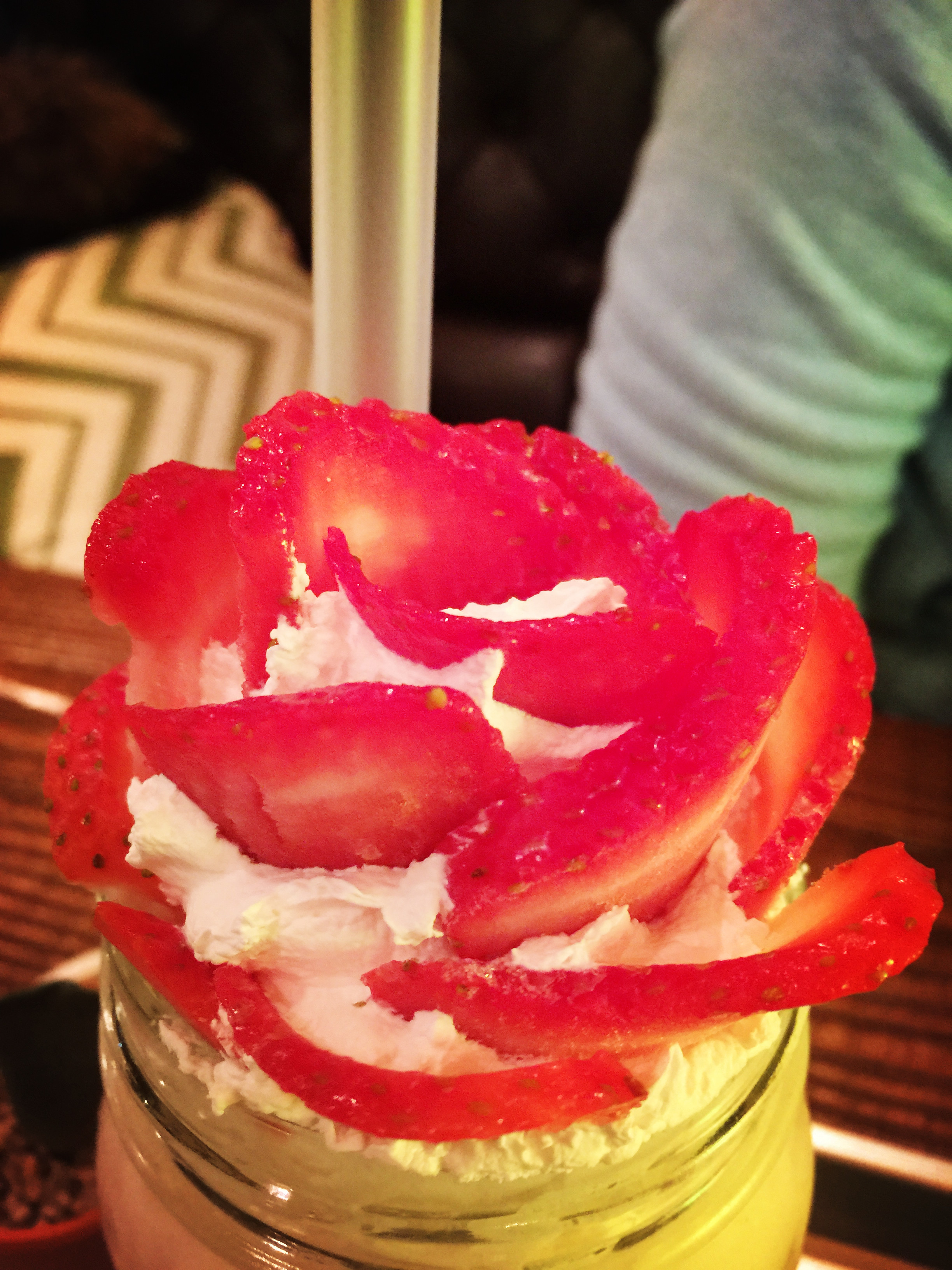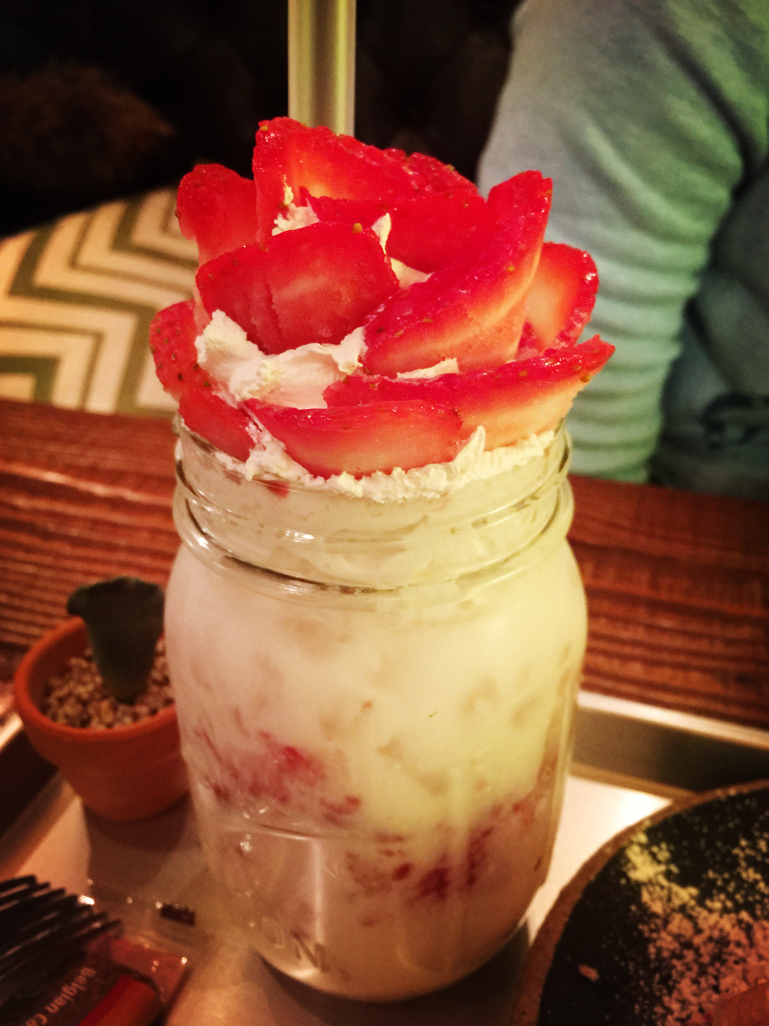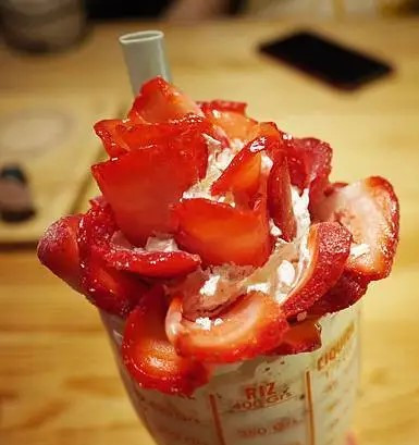 杯子裡是滿滿的草莓、牛奶、鮮奶油